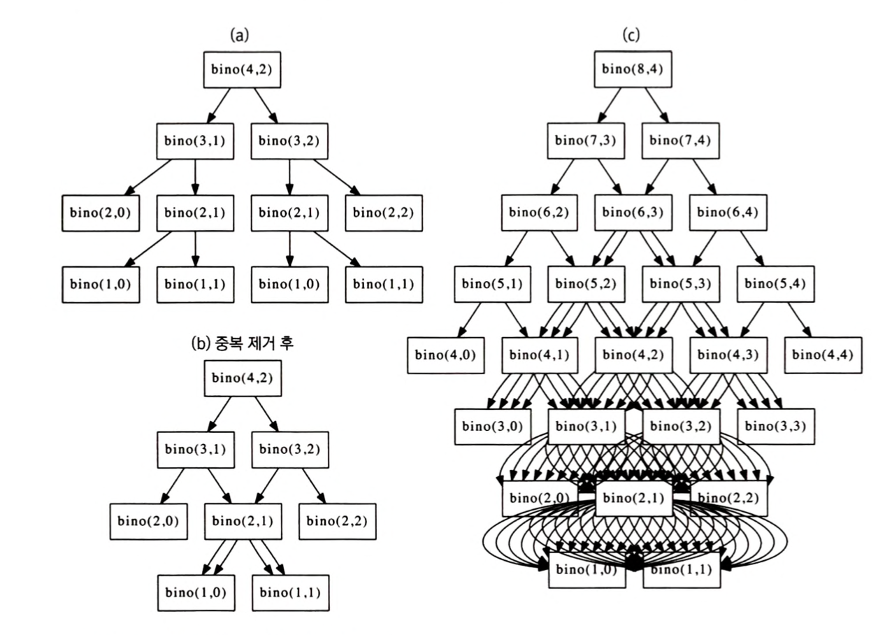 입력인 n과 r이 정해져 있다면 bino(n, r)의 반환 값이 일정하다는 사실을 이용하면 이 문제에서 중복 계산을 제거할 수 있다. 각 n, r조합에 대해 답을 저장하는 캐시 배열을 만들어서 각 입력에 대한 반환 값을 저장한다면, 함수는 매번 호출될 때마다 이 배열에 접근해 값이 저장되어 있는지 확인한 뒤, 저장되어 있다면 이것을 즉시 반환한다. 만약 계산이 되어 있지 않다면 직접 계산해서 배열에 써넣고 반환한다.
