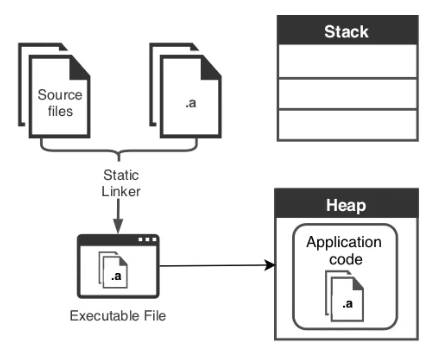 Static library를 사용하면 Static linker가 작성한 소스 코드들과 라이브러리 코드들을 연결하고 최종적으로 Source files 와 static library가 결합된 Executable file이 생성 되어 프로그램에 포함 됩니다.