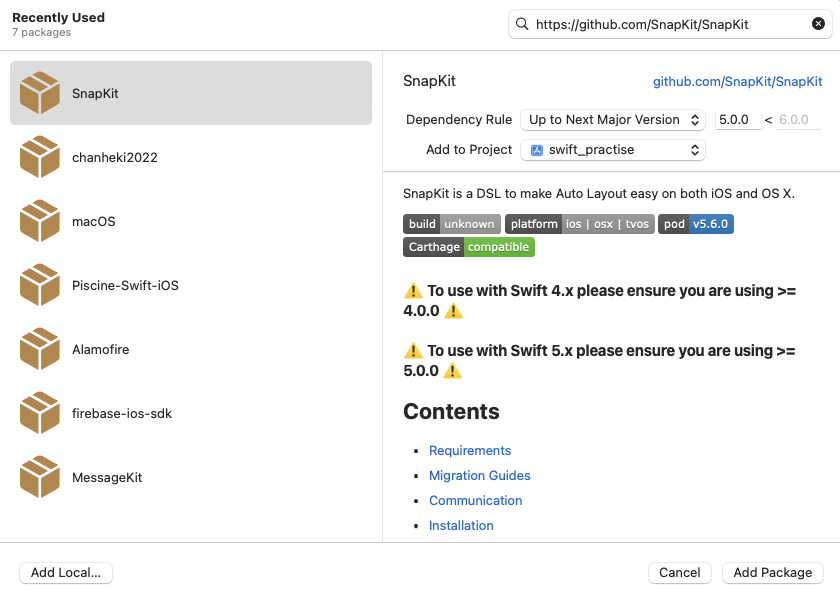 Autolayout Library인 SnapKit을 예시로 들어보면, 우측 상단에 SnapKit URL을 입력후 Add Package로 등록하여 사용할 수 있습니다.