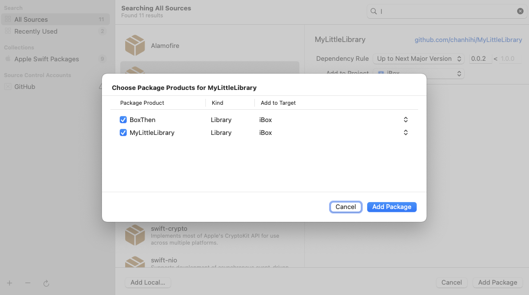 .remote(url: "https://github.com/chanhihi/MyLittleLibrary", requirement: .exact("0.0.2"))