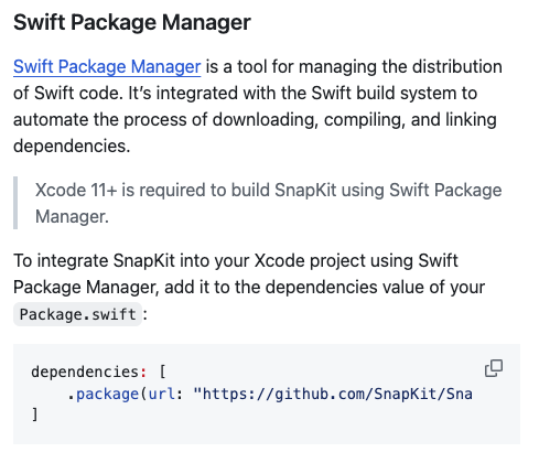 SnapKit ReadMe에서 SPM으로는 어떻게 사용할 수 있는지 확인하실 수 있습니다.