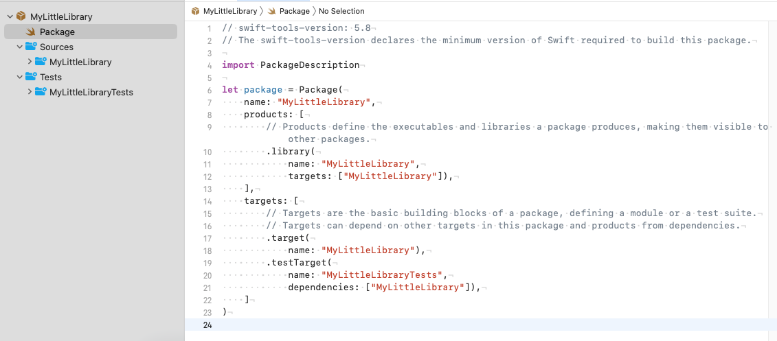 만들어진 Package를 살펴보면, Package.swift는 manifest파일이고, 이 파일로 해당 디렉토리를 Swift Package로 식별하게 됩니다.