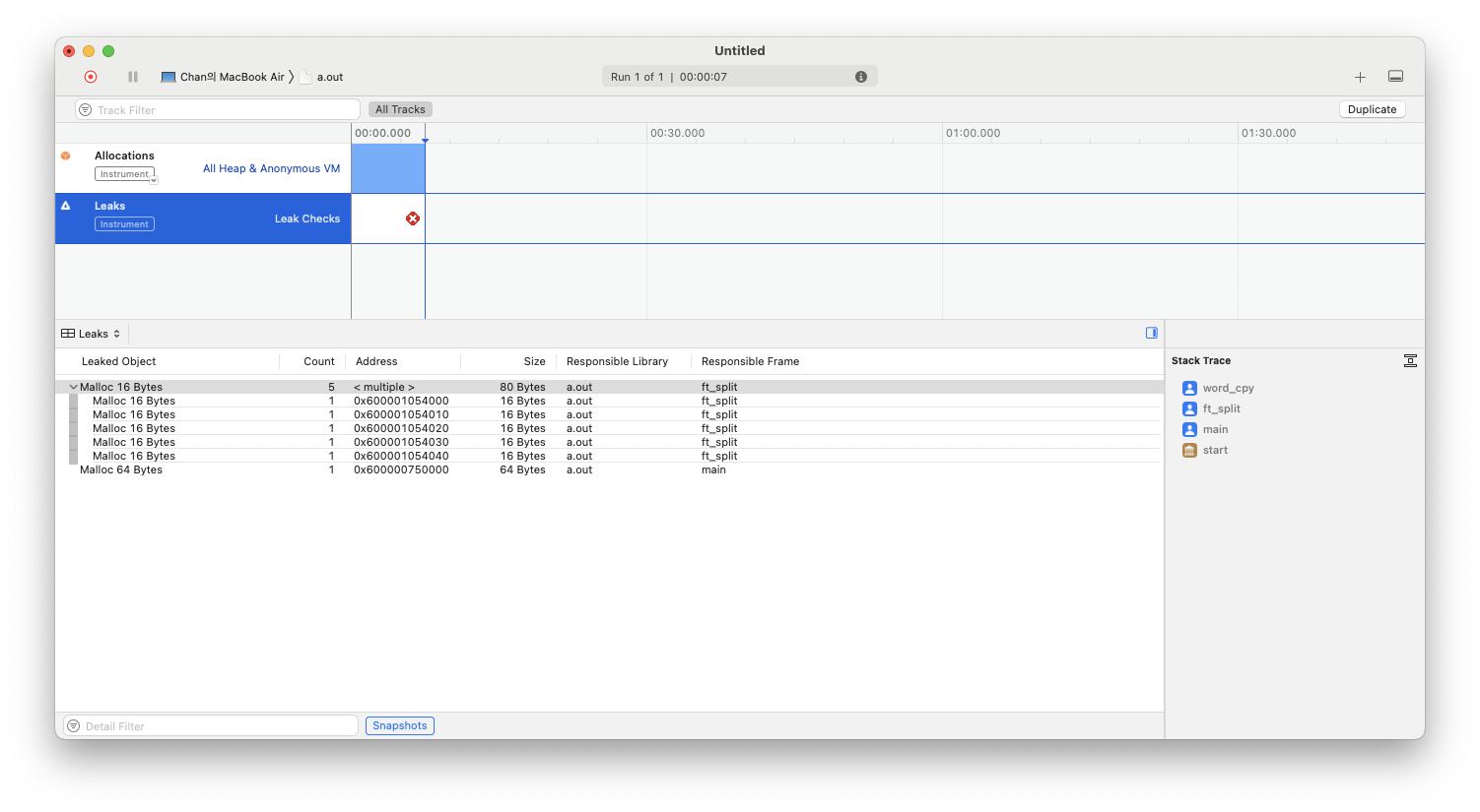Leaks 외에도 여러가지를 테스트 해볼 수 있다. C에서 주로 사용하게 될것은 Leaks혹은 Allocations 정도.