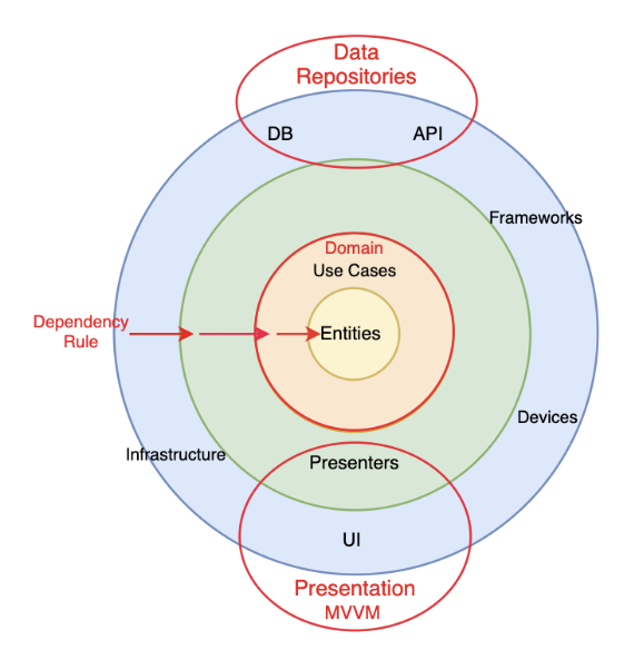 2. 외부 레이어(Presentation Layer와 Data Repositories Layer)는 내부 레이어인 (Domain Layer)의 비즈니스 로직을 기반으로 기능을 수행합니다. 외부 레이어는 내부 레이어에만 의존할 수 있으며, 다른 외부 레이어나 프레임워크와의 의존성은 가능하더라도, 이 의존성이 역방향으로 가는 것은 허용되지 않습니다. 예를 들어, ViewModel(Presentation Layer)은 Domain Layer의 Use Cases를 호출하여 데이터를 가져오고 처리할 수 있지만, 그 반대는 안 됩니다. Domain Layer의 Use Cases는 ViewModel의 모든 요소에 대해 아무것도 알지 못해야 합니다. 호출하거나 변경할 수 없습니다.