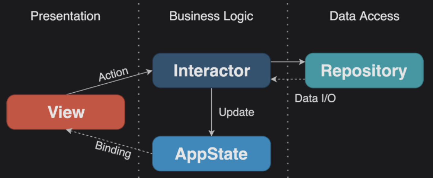 그리고 해당하는 아키텍처 View, Interactor, AppState, Repository에 관해서 자세하게 설명을 해줍니다.