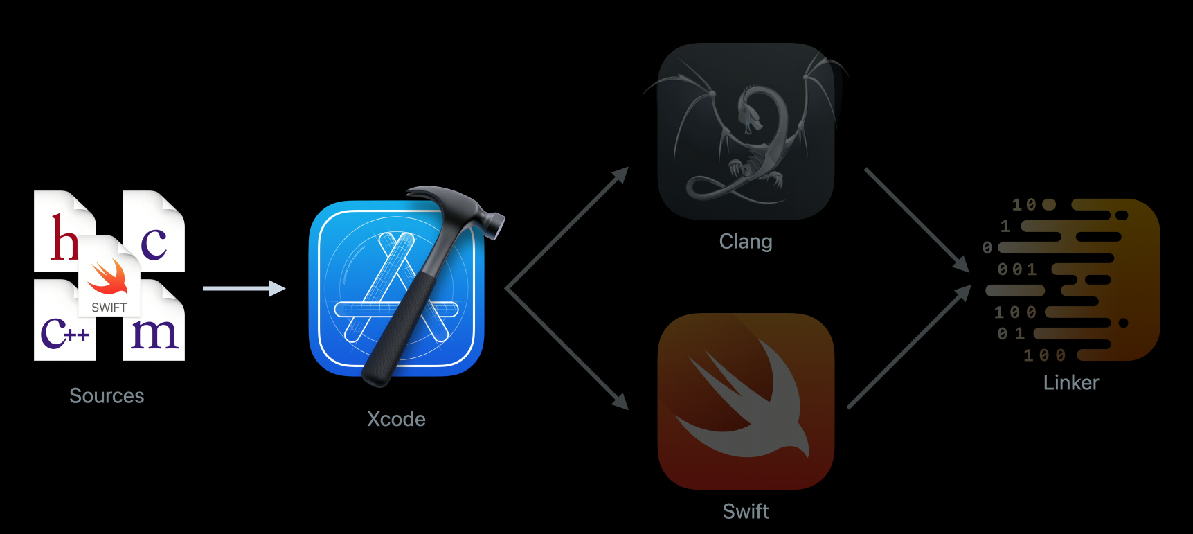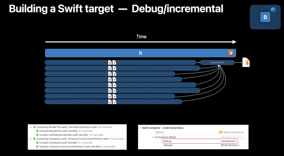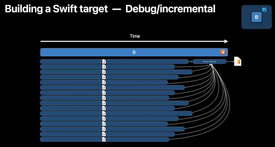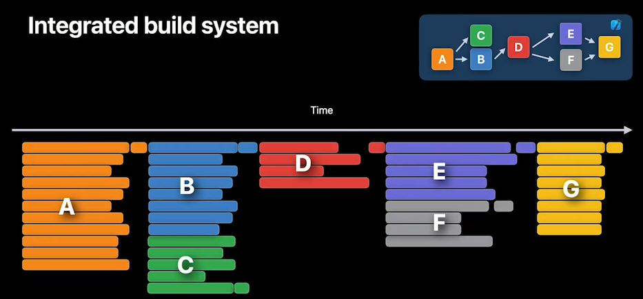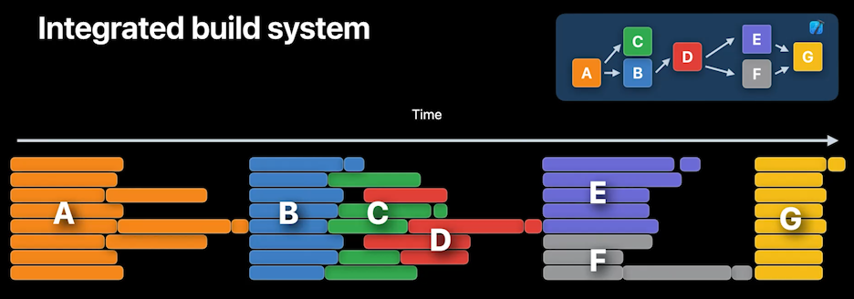 Xcode와 Swift의 통합으로 인해 프로젝트의 구조, 모듈화, 타겟 product 사이의 종속성으로 구성된 전체적 그래프 모양 및 그 안에 있는 빌드 단계의 수와 복잡성, 기기의 자원까지 Xcode가 고려하여 빌드를 병렬화하고 속도에 대해 기여를 할 수 있게 되었습니다.
