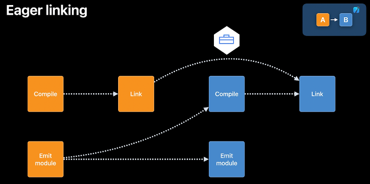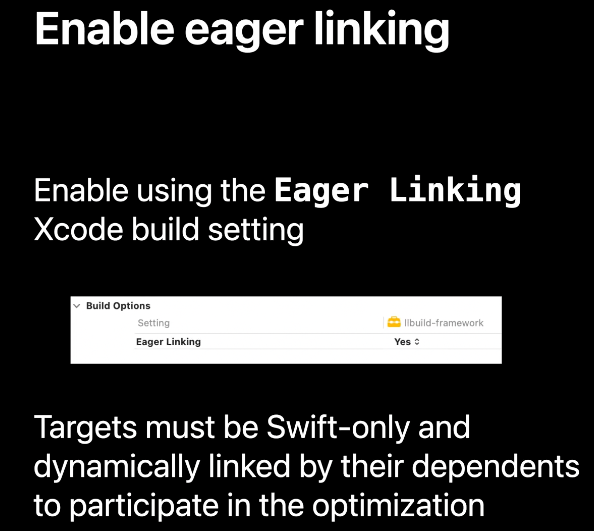 Eager linking은 디펜던시 항목에 의해 동적으로 링킹된 모든 Swift-only 타겟에 적용됩니다.