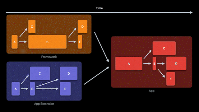 위 사진을 보면 프레임워크와 앱 익스텐션은 종속적이지 않기 때문에, 병렬로 작업이 실행되는 것을 확인 할 수 있습니다.