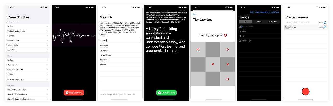 This repo comes with lots of examples to demonstrate how to solve common and complex problems with the Composable Architecture. Check out this directory to see them all, including:
