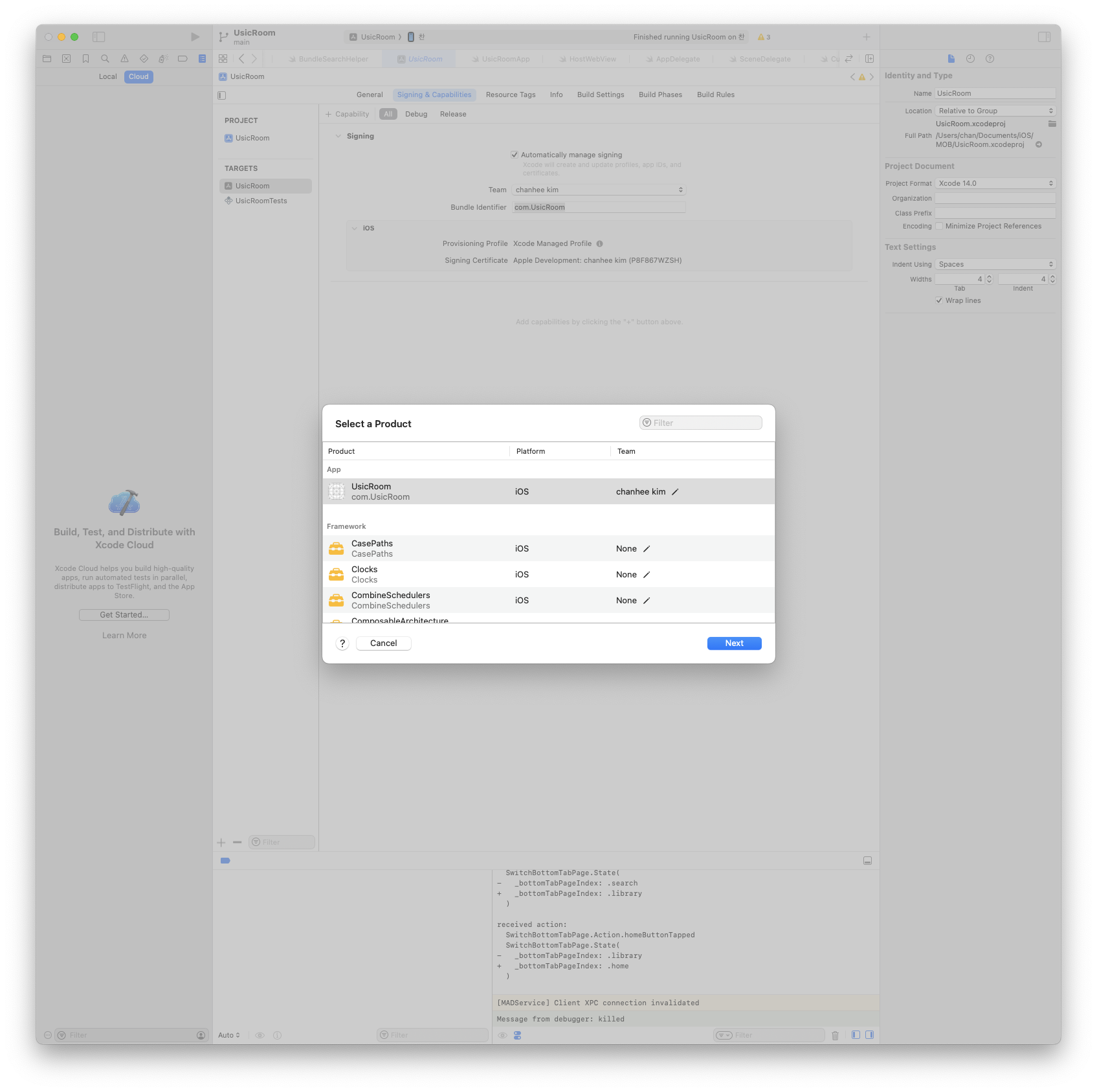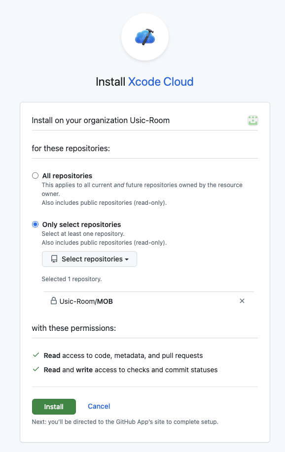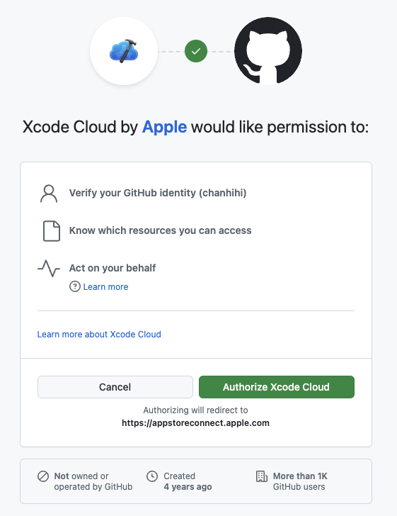 쭉쭉 Next를 선택하여 지나가면, GitHub와 Xcode Cloud를 연결하라고 하는데, 연결해주면 됩니다.