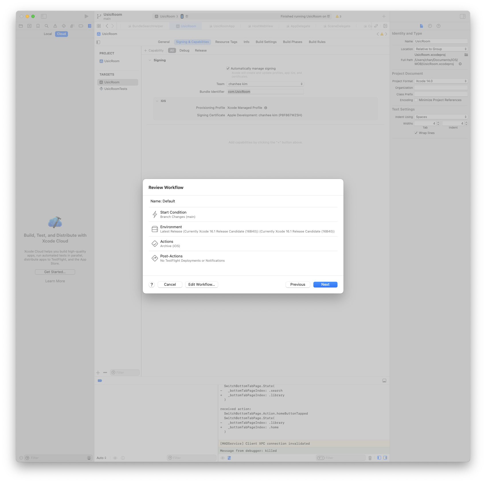 여기까지 Xcode Cloud를 통해서 Github 브랜치에 있는 것들을 workflow를 진행하는 것을 살펴 보았습니다.