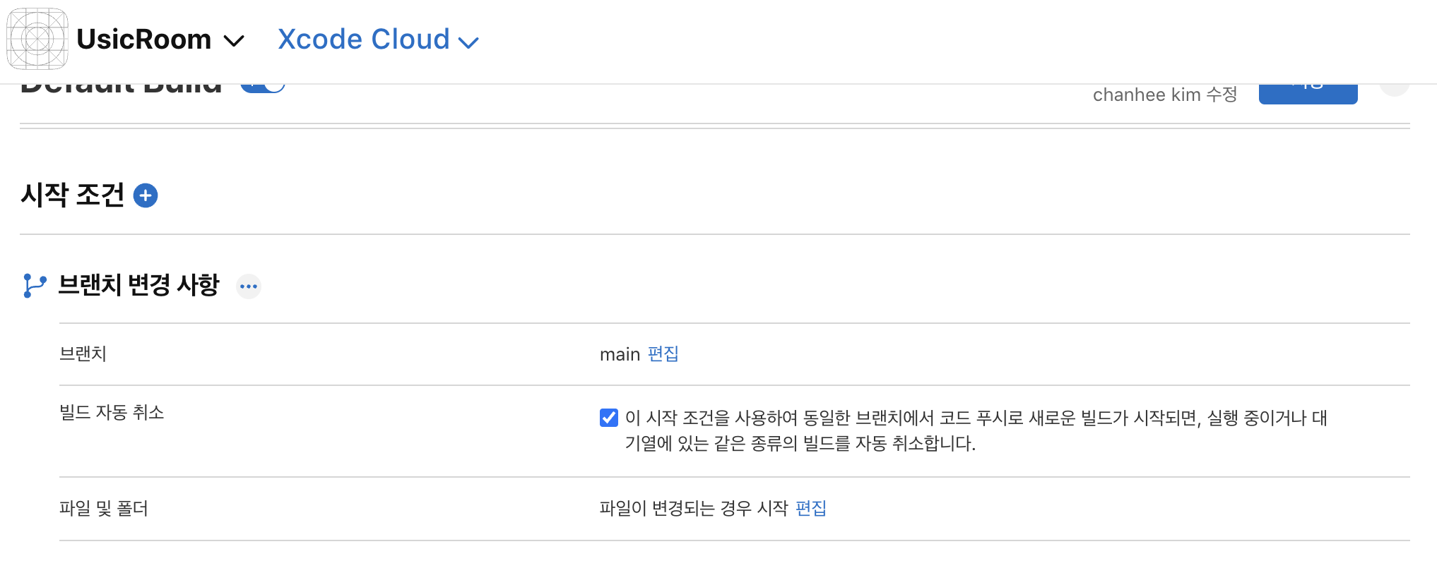 또는 AppSotre Connect 웹에서 Xcode Cloud를 사용하여 main branch가 변경된 경우 바로 앱을 Xcode Cloud 상에서 CI/CD를 가능하게 하는 기능도 있습니다.