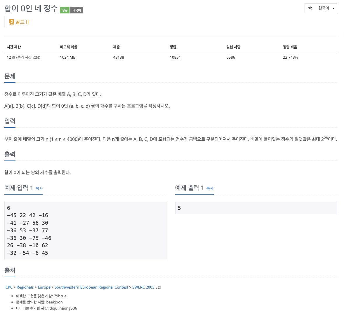 map을 사용해서 AB의 합을 먼저 구하고, 이후 CD의 합으로 unordered_map으로 접근 O(1) -> N^2 + N^2의 시간으로 풀 수 있을 거라 판단 최악의 경우 4000^2 + 4000^2으로 32,000,000번의 연산으로 충분히 풀 수 있을 거라 생각했습니다.