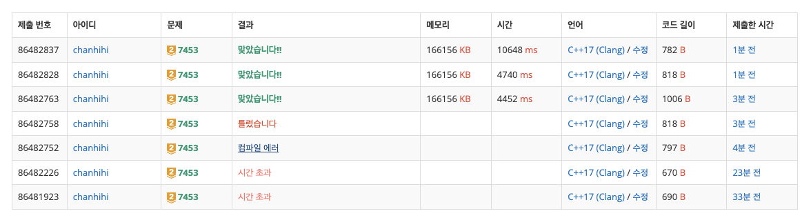 첫번째 제출번호 86482837 - A 정렬을 하지 않은 코드